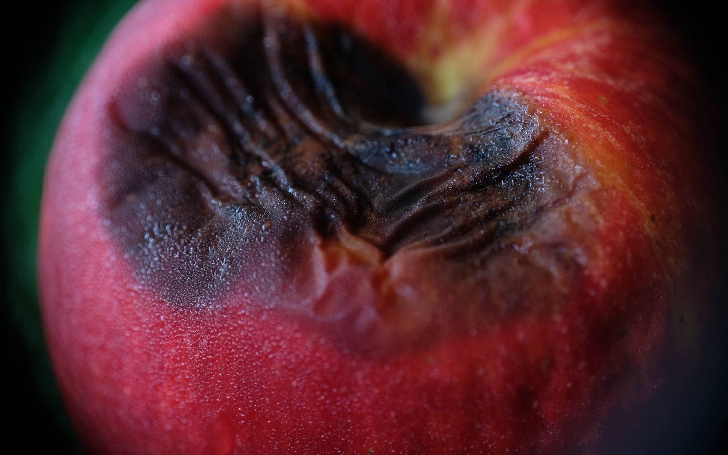 Alternaria rot, also called black rot, can be recognized by black spots on brown skin. These fruits can ultimately also become completely rotten and soft. The fungus can also attack via an open blossom-end of the apple. This fungus is common in connection with skin disorders such as 'soft scald' and 'sunburn'.