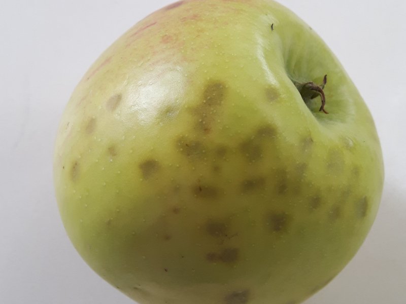 Bitter pit can already be present at harvest. But it can also develop later in storage. It shows as dotted dark corky spots, which occur on the skin or under the skin in the flesh, or both. The spots do indeed have a bitter taste. The cells in the spots are dead and turn brownish-black. Spots can be more located towards the calyx end of the apple. This disorder is often related to a lack of calcium in the fruit, and solutions may be found in the pre-harvest stage.