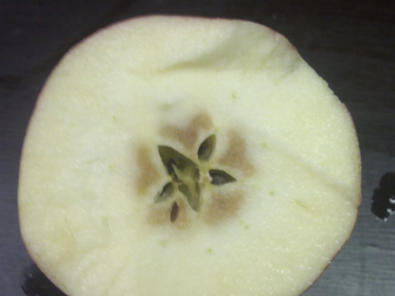 Core browning or also called 'core flush'. The flesh close to the core cavity is discoloured. The tanning can vary from diffuse light brown to dark clearly bounded areas. This disorder is associated with senescence (overripe apples) or with storage conditions (higher CO2).