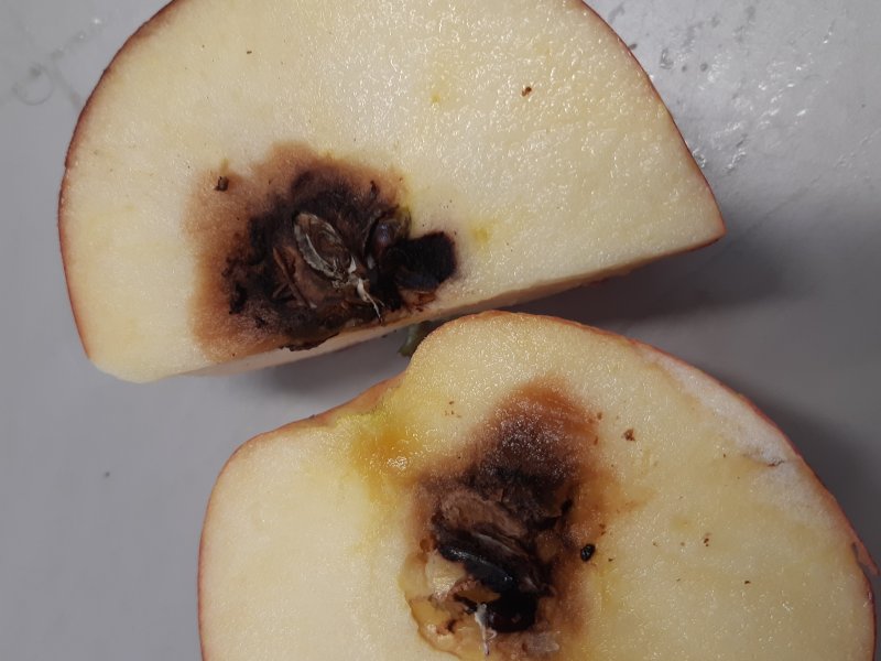 Core rot is caused by fungi that cause diseased parts around the core. The rot can be soft and watery, but also dry and cork-like. It can extend to the stem and to the blossom-end of the apple. In that case it can become also visible from the outside. The infection has occurred in the orchard.