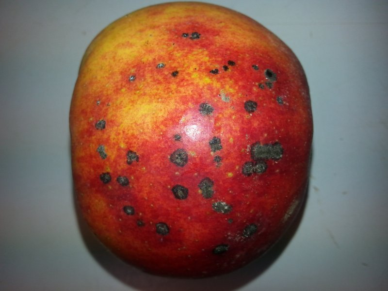 Apple scab is caused by the fungus Venturia. It can resemble a dark skin wart or shows as several small black spots. It is usually already visible at harvest, but can also develop during storage from earlier infections and is then called: storage scab. Scab is most common on organically grown fruit.