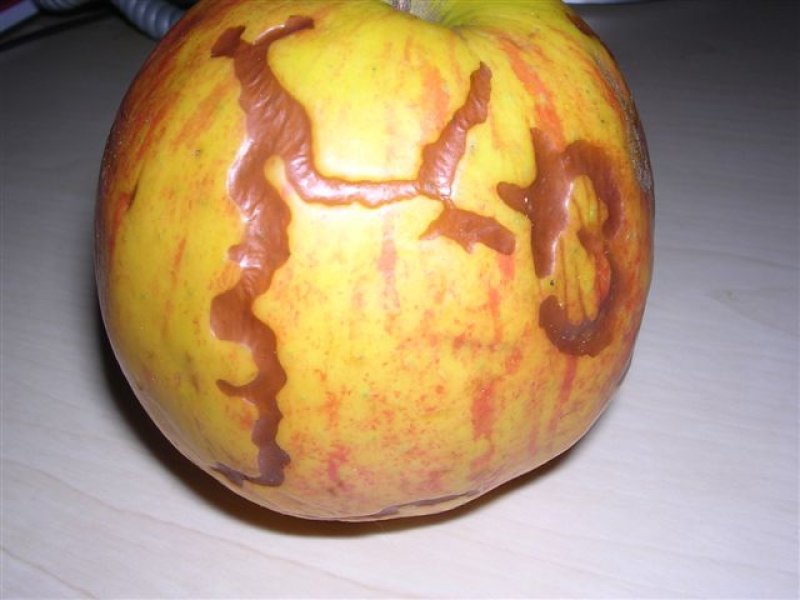 Soft scald has typical symptoms. The affected skin is soft and smooth and shows an irregular ribbon-like brown area with sharp edges. At a later stage, secondary fungus infections can follow that spot the brown area with black. The flesh just below the brown skin is usually soft. It usually appears early in storage and is a type of chilling injury. A preventive measure is therefore a stepwise cooling-down at start of storage.
