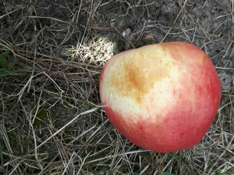 Sunburn on apples is caused by bright sun and high temperatures in the orchard before or shortly after harvest. The affected roundish spot on the apple is usually only slightly discoloured. But in more serious cases, the burnt skin becomes browner or even black, and the fruit flesh can also be damaged. The symptoms can become more severe during storage and is then also called sunscald. Darkened lenticels, sometimes cracked, can also be part of extreme sunburn.