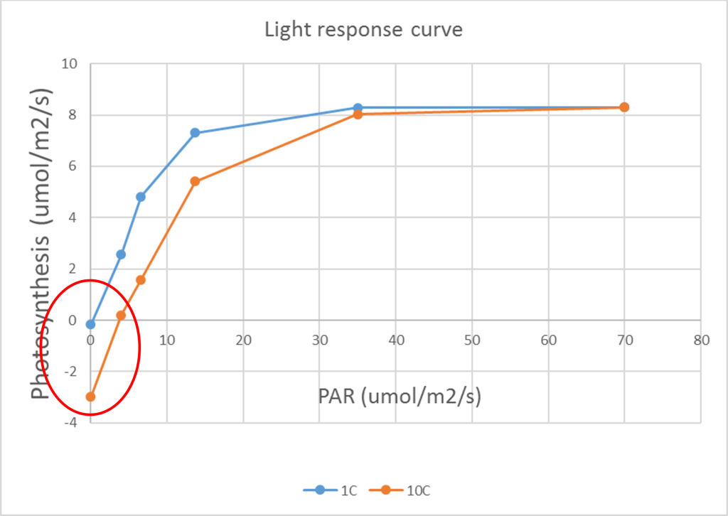 The results are an indication that it works through photosynthesis. In the following figure light response curves of lettuce show that at 10C a light level of 5 µmol m-2 s-1 PAR is slightly above the light compensation point, meaning there is net photosynthesis due to low respiration, resulting in sugar production. Moreover, it is shown that at lower storage temperature the leaves have even lower light compensation points. This supports the finding that a combination of low temperature with a low light level preserves quality of fresh-cut leafy vegetables for a longer time.