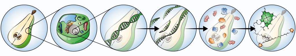 A harvested fresh product is alive, meaning that it is still biologically active. Each living product consists of lots of cells in which all kinds of processes take place. In response to external factors, such as light, temperature and oxygen availability, cells react by making copies of parts of their DNA that will help them respond to these external factors. For example, in response to ethylene, they respond by ripening. They do this by copying sections of DNA related for example to cell wall degradation (fruit softening) or to chlorophyll breakdown (changing colour from green to yellow). The processes on this cellular level can be studied, usually with the purpose to make a link between a micro cellular process and a macro fruit process. This field of studies is called 'Omics'. Omics disciplines give an overview of the processes that occur within a product on a molecular level.