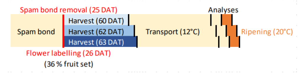 Experimental setup to control melon maturity and harvest time followed by equal post-harvest treatments: in Brazil, melon plantlets were transplanted and grown under a spam bond. When flowering commenced, the spam bond was removed and over 300 flowers were labelled. Fruit set was 36% and after 60, 62 and 63 days after transplant (DAT), melons were harvested and placed at the transport temperature (12 °C) until all melons were harvested and transported to the Netherlands. Once there, starting 27 days after harvest, the melons were analysed over the course of one week of additional storage and one week of ripening at 20 °C, with equal times between harvest and each analysis time-point.
