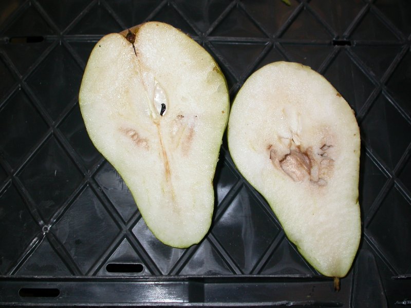 Brown core is an internal disorder seen under Controlled Atmosphere storage. The symptoms are visible only after cutting the fruit. It is often referred to as a CO2 injury. But the susceptibility to CO2 injury increases with a lower O2, so the ratio between O2 and CO2 is important. This injury starts with browning in tissue around the core. In this area, cavities can develop later when the tissue dries out. The susceptibility to this disorder increases with a higher maturity at harvest.