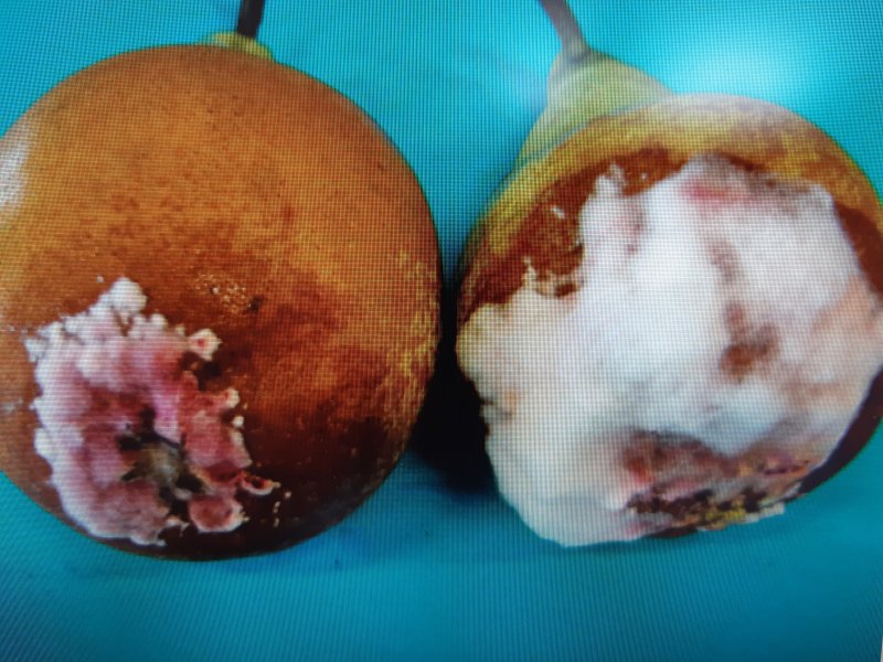 Fusarium is a soft rot. Characteristic is the white-yellow-pink mycelium. Most often, the pear's blossom-end or stem-end is affected. The fungus can form nests of rot in stored pears. Fusarium is a so-called wound pathogen. Hence, preventing wounds and damages can reduce the risk of decay.