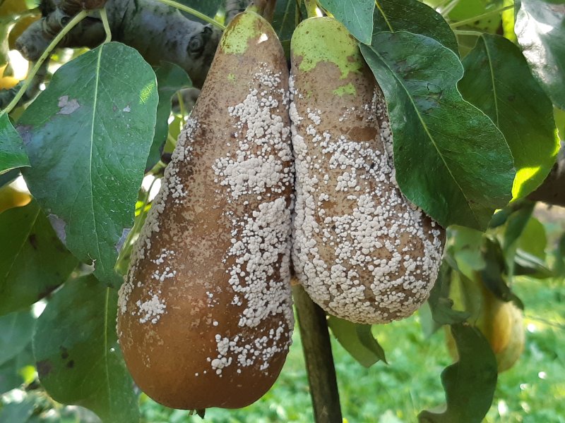 Monilia rot (brown rot) is a firm brown rot which is usually already visible in the orchard. The first indication of infection is a small circular brown spot. Then white mould may appear. During storage, fruits can turn completely black, while the skin remains shiny and unbroken. Prevention of injuries in the skin helps to reduce infection.