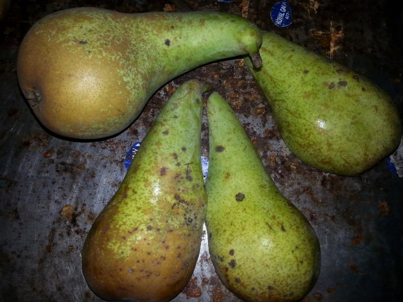 Pear scab is caused by the fungus Venturia. It can resemble a dark skin wart or shows as several small black spots. It is usually already visible at harvest, but can also develop during storage from earlier infections and is then called: storage scab. Scab is most common on organically grown fruit.