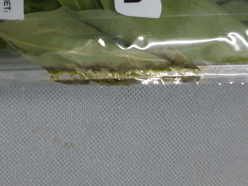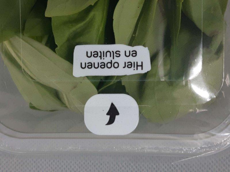 Attention! A basilicum leaf is captured between the topseal and of the plastic punnet. Photo by WUR