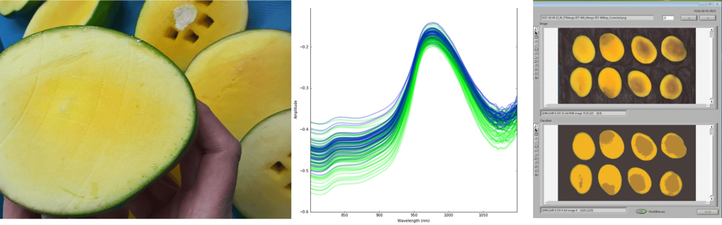 Measuring NIR spectra allows us to predict internal defects in a non-destructive way. The experiment performed showed that by analyzing differences in NIR spectra, mangos could be classified in “defected” or “healthy” fruit, with an accuracy of 86%.